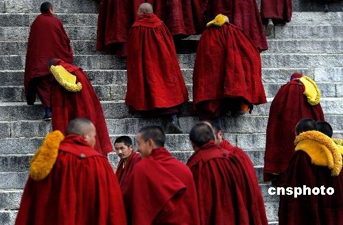 3月4日,中國藏歷新年正月初八,西藏拉薩哲蚌寺舉行傳昭大法會,該寺僧人辯經結束后進入措欽大殿。中新社發 廖攀 攝