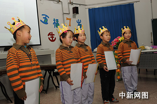 3月4日,在北京豐臺區實驗小學就讀的河北滄州五胞胎繳福慶、繳福森、繳福莉、繳福欣、繳福源迎來7周歲生日,學校為他們舉辦了“快樂與感恩”主題班會。正在北京開“兩會”的黑龍江省全國人大代表蘇艷霞抽閑參加了生日會并向五胞胎贈送了生日禮物,7年來,蘇艷霞女士一直關注著“五福娃”的成長。王少華 張書儉 攝