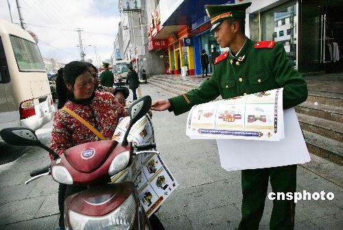 3月5日是中國“學(xué)雷鋒日”,西藏消防總隊(duì)的官兵在拉薩市北京中路向過往市民發(fā)放消防宣傳畫和講解消防知識。中新社發(fā) 劉震 攝