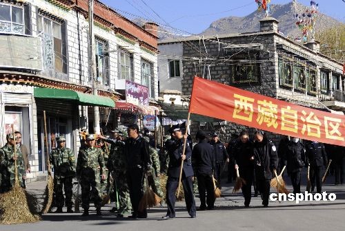 3月7日,西藏民警在拉薩東城清掃街道,為民眾服務。中新社發 廖攀 攝