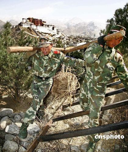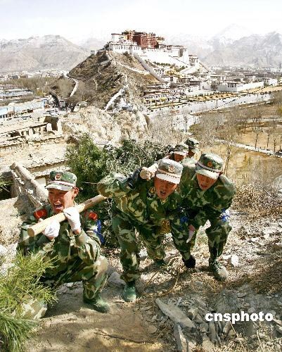 2009年3月12日,武警西藏總隊2000多名官兵來到拉薩市藥王山,揮鍬舞鎬為綠色生態拉薩增添了一片新綠。中新社發 張權 攝