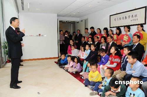 當(dāng)?shù)貢r(shí)間三月十二日,正在美國訪問的中國外交部部長楊潔篪來到中國駐美大使館視察中國250多家駐外使領(lǐng)館中的一所學(xué)校——駐美使館陽光學(xué)校。楊潔篪在和學(xué)校孩子們交談時(shí)鼓勵(lì)他們學(xué)說中國話,學(xué)寫中國字,學(xué)做中國人,并為陽光學(xué)校題寫校訓(xùn):“愛國勵(lì)志勤學(xué)奉獻(xiàn)”。圖為楊潔篪在和陽光學(xué)校老師和孩子們交流中。 中新社發(fā) 邱江波 攝