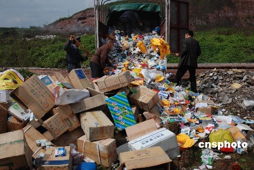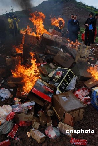 3月13日,重慶市璧山縣工商、質監、煙草等相關部門將收繳的假冒偽劣商品集中銷毀。據悉,此次被銷毀的偽劣商品有化妝品、日用品、假煙、假酒等539個品種。中新社發 謝捷 攝