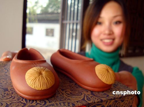 2009年3月16日,蘇州市一家紫砂工藝品商店內擺放的“迷你”紫砂女鞋工藝品,吸引了許多顧客的目光。這些“迷你”紫砂女鞋由宜興紫砂工藝師制作。中新社發 王建康 攝
