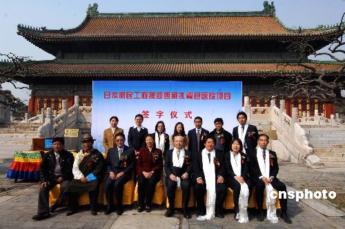 三月十七日,日本援助西藏扎囊縣醫院立民項目簽字儀式,在西藏自治區人民政府駐北京辦事處舉行。西藏自治區人民政府駐北京辦事處副主任趙國慶女士(右五)與日本駐華大使館公使片山和之先生(右四)出席了簽字儀式。此項目向扎囊縣醫院援助六十萬人民幣,扎囊縣常駐人口有三點六萬人。中新社發 馬偉東 攝