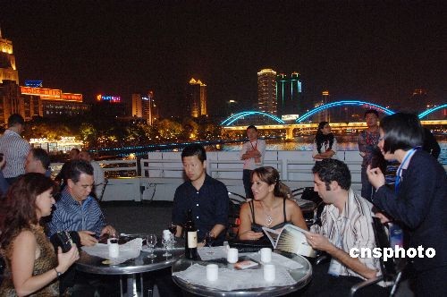 正在廣州舉行的廣州家具博覽會組委會,3月18日晚在“ 珠江夜游”的游艇上舉行了“全球買家之夜”聯誼活動,近年,“珠江夜游”已成為廣州旅游熱線,不少商家和機構都將聯誼及商務活動安排在游艇上舉辦,令客人在欣賞珠江兩岸夜景之時亦可增進相互之間的友誼。中新社發 梁永強 攝