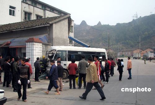 三月二十一日下午二時左右,福建寧德市區一輛載有十余人的公交車因緊急剎車躲避前方突然掉頭的小車,撞上了路旁圍墻,造成至少兩人受傷。當地消防、交警、醫療等部門聞訊迅速趕到現場進行處置,很快救出被困人員。中新社發 張彩林 攝