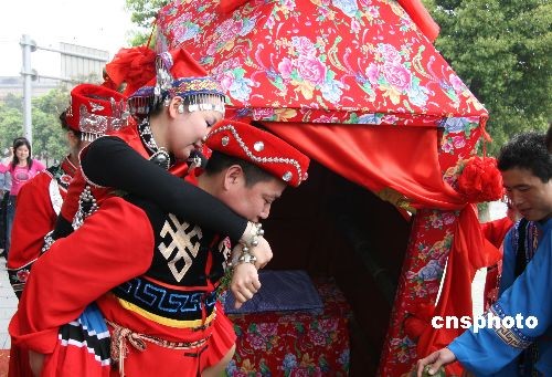 3月21日,長(zhǎng)沙一對(duì)新人在市區(qū)舉辦了一場(chǎng)別開生面的中式民族婚禮,賺足了路人的眼球。中新社發(fā) 鄧霞 攝