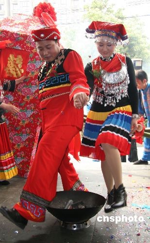 身著民族服飾的新郎新娘手牽手一同跨過火盆,意喻今后的生活將紅紅火火。