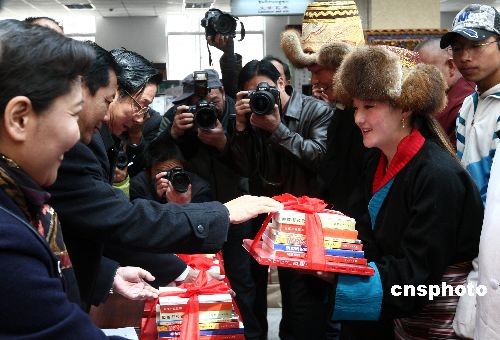 3月25日,紀念西藏民主改革50周年獻禮圖書首發式在拉薩舉行。藏漢文版大型畫冊《西藏今昔》、全彩版圖書《雪域邊線行》、藏文版《西藏民主改革50年》等圖書在具有歷史重大意義的時候為讀者獻上一份厚禮。中新社發 杜洋 攝