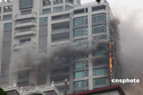 二十六日上午十一時,廣州市濱江東路中山大學牌坊文化廣場旁一高層住宅樓發生火警,火勢從大樓外墻電線一直向樓頂蔓延,幸有消防員及時撲救,事故中無人員傷亡。中新社發 羅仰明 攝