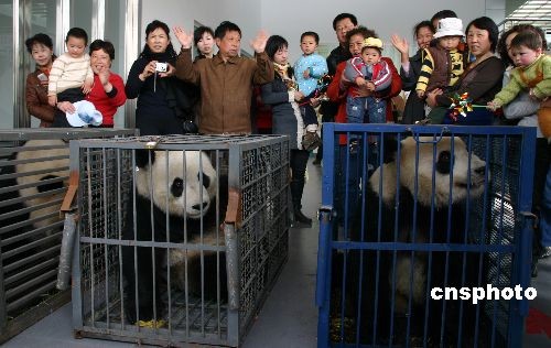 2009年3月26日,在南京紅山森林動物園生活了近一年的美靈、晶晶、仙子三只大熊貓即將返回四川臥龍老家,眾多市民專程趕來為大熊貓送行。2008年4月18日,來自四川臥龍中國保護大熊貓研究中心的三只3歲左右的大熊貓租借到南京紅山森林動物園。中新社發 阿董 攝
