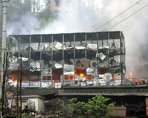 上午9點10分,火勢基本被控制。記者看到,1號樓已完全垮塌。1號樓前的3號樓只剩下了空架子;1號樓后民工食堂搭起的一個簡易棚也遭燒光,大火順著簡易棚的頂部,蔓延到了堡坎上的一排磚瓦結構平房。