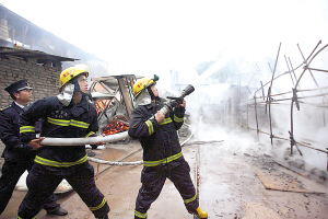 大約8點30分,活動板房底樓最邊上的一個房間最先冒出濃煙,接著躥起明火。江北區消防支隊石馬河中隊在10分鐘內趕到現場,最先起火的1號樓已被大火吞沒,3號樓也開始燃燒。20分鐘內,兩棟活動板房就已完全過火。