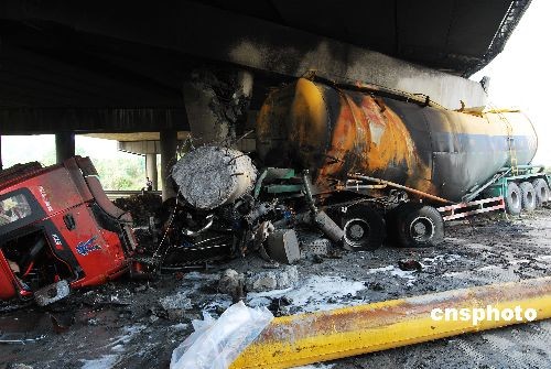 4月17日凌晨,在湖南郴州市郴資桂高等級公路與京珠高速公路交叉處,一輛水泥槽罐車由東往西方向行駛,因貨車司機疲勞駕駛撞上京珠高速主線由南往北橫跨郴資桂大橋(K490+200北上)的橋墩上,造成貨車起火,兩根立柱斷裂,一根立柱受損,該大橋橫梁塌落,往北方向的橋面塌陷,京珠高速公路耒宜段郴州至良田被迫中斷交通。肇事車輛上1人死亡,1人受傷,1人逃逸。事故發(fā)生后,湖南省郴州市、省交通廳、省高速公路管理局領(lǐng)導立即趕赴現(xiàn)場,指導現(xiàn)場處置、交通救援和事故處理,做好保安全、保暢通、保穩(wěn)定工作。上午10時南行線通車,下午14時,單幅雙向間斷恢復通車。目前,省市有關(guān)部門正在緊急進行橋梁的加固搶修,防止橋面整體坍塌。事故原因進一步調(diào)查和善后處理正在有序進行之中。中新社發(fā) 賀茂峰 攝