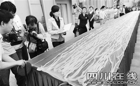 “哇!好長的米線!”昨日(26日)上午10點,成都萬達(dá)廣場臨時搭建的舞臺上,10名工作人員抬出了一個直徑為2米的大圓盤。圓盤上,一根長長的米線引起了圍觀者的驚呼。據(jù)悉,這束米線長度超過500米,將向現(xiàn)有最長方便米線的吉尼斯紀(jì)錄420.4米發(fā)起挑戰(zhàn)。