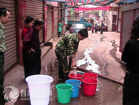 男女老少紛紛拿起大盆、小盆、水桶爭先恐后向消防車趕來。“大家不要擠,按次序排隊”,當消防官兵打開出水閥門,白花花的自來水流進群眾拿著的大盆、小盆,水桶時,群眾臉上頃刻洋溢著喜悅的微笑。