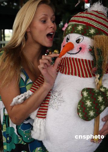 12月4日晚,正在廣東深圳參加第34屆國際比基尼小姐大賽的各國佳麗,來到灣區會館參加公益活動。圖為一名佳麗在會館布置的圣誕雪人前拍照。中新社發 錢興強 攝