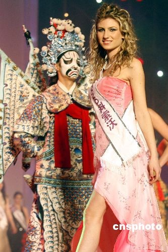 3月25日晚,身著盛裝的國(guó)際旅游小姐同中國(guó)傳統(tǒng)臉譜在河南鄭州同臺(tái)獻(xiàn)藝。當(dāng)晚,2008國(guó)際旅游小姐冠軍總決賽最佳晚裝小姐單項(xiàng)賽在河南鄭州舉行,來自115個(gè)國(guó)家和地區(qū)的佳麗參加了角逐。中新社發(fā) 慎重 攝