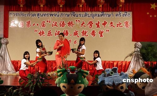 6月6日,由中國駐泰國大使館和泰國教育部高等教育委員會聯合舉辦的泰國第八屆“漢語橋”大學生中文比賽在曼谷城市酒店舉行。選拔自泰國朱拉隆功大學、法政大學、皇太后大學等19所精英大學的19名選手用地道的漢語闡述了“快樂漢語,成就希望”的大賽主題,表達了泰國大學生對中國的期盼與祝福。經過4個多小時緊張激烈的比賽,由中泰雙方漢語專家組成的大賽評委會評出了一等獎2名、二等獎4名、三等獎6名、積極參與獎7名、優秀組織獎2所大學。當日獲得一等獎的來自博仁大學的董詩碧和易三倉大學的江振茂兩位同學,將代表泰國到中國參加全球決賽,其他選手也獲得了到中國進參加秋令營的獎學金。中新社發 顧時宏 攝