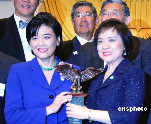 七月二十三日晚,國(guó)際領(lǐng)袖基金會(huì)在華盛頓舉行頒獎(jiǎng)晚會(huì),獎(jiǎng)勵(lì)杰出的亞裔人士,在美國(guó)國(guó)會(huì)中僅有的兩名華裔議員吳振偉、趙美心分別獲得“年度杰出公職服務(wù)獎(jiǎng)”。圖為美國(guó)“國(guó)際領(lǐng)袖基金會(huì)”執(zhí)行長(zhǎng)、曾任美國(guó)商務(wù)部少數(shù)族裔發(fā)展署副署長(zhǎng)兼幕僚長(zhǎng)的華裔政界名媛董繼玲(右),向美國(guó)華裔女眾議員趙美心頒獎(jiǎng)。國(guó)際領(lǐng)袖基金會(huì)為全美最著名的亞裔青年領(lǐng)袖訓(xùn)練機(jī)構(gòu),每年定期表?yè)P(yáng)促進(jìn)國(guó)際經(jīng)貿(mào)繁榮、發(fā)揚(yáng)中華文化傳承有卓越成就的杰出人士。中新社發(fā) 吳慶才 攝