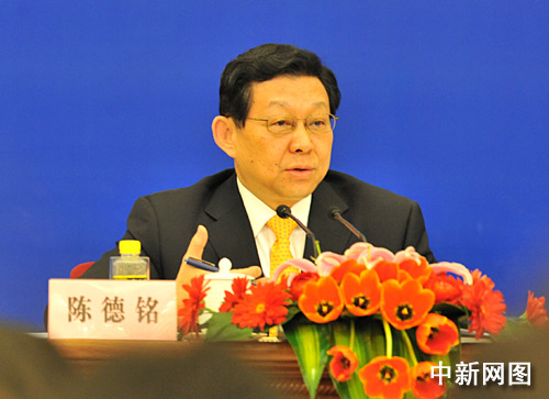 3月6日上午10點,國家發展和改革委員會主任張平、財政部部長謝旭人、商務部部長陳德銘、中國人民銀行行長周小川在人民大會堂三樓金色大廳就加強和改善宏觀調控問題答記者提問。 中新網記者 賈國榮 攝
