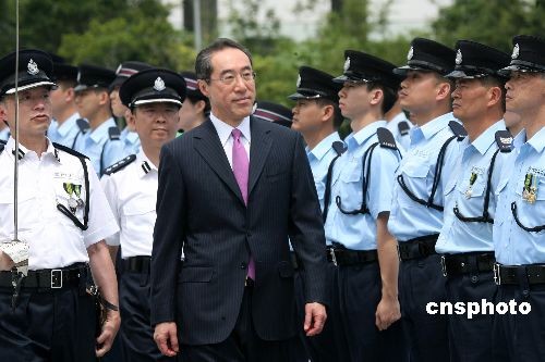 五月三十日上午,香港特區(qū)政府政務(wù)司唐英年司長(zhǎng)出席此間舉行的“香港輔助警察隊(duì)五十周年暨結(jié)業(yè)典禮閱操儀式”時(shí),檢閱剛剛完成入職培訓(xùn)的輔警隊(duì)生力軍,及完成晉升、延續(xù)訓(xùn)練的輔警。于一九五九年正式成立的香港輔助警察隊(duì),五十年來(lái)以兼職形式與正規(guī)警隊(duì)合作無(wú)間,令香港成為世界上最安全的城市之一。中新社發(fā) 鄭祚聲 攝