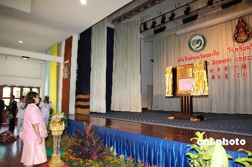 六月十二日的泰國吉拉達學校古老校園里洋溢著濃郁的中國文化氣息。在喧天的鑼鼓聲中,泰國瑪哈扎克里·詩琳通公主殿下按動電鈕,寫有“吉拉達學校孔子課堂”的牌匾徐徐拉開帷幕,標志著泰國第七家孔子課堂正式落戶這個坐落于泰國王宮里的學校。揭牌儀式上,詩琳通公主還興致勃勃地重酌墨水,揮毫為孔子課堂題寫了“學無止境 ”四個漢字,并勉勵泰國各孔子學院、孔子課堂擔當起推動泰國漢語教學進步、促進中泰友好關系發展的重任。中新社發 顧時宏 攝