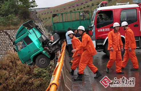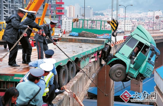 事發(fā)當時,大貨車上連駕駛員共有3人。駕駛員劉先生心有余悸地說,當時,他們3個人都全被嚇蒙了。等他們反應過來后,伸出頭一看,車頭全部懸掛在立交橋外面,離地面有30多米高,隨時有掉下去的危險,難以脫離險境。之后,還是隨行的貨主撥打了報警電話并向消防求援。