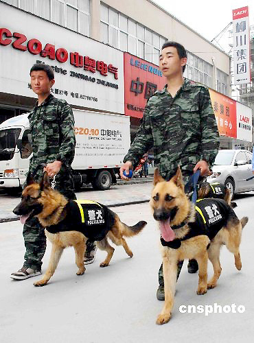 近日,浙江溫州市樂清公安局首次將警犬投入到社會治安管理中。首批4條警犬分為兩組:一組負責樂清柳市車站周邊的巡邏,另一組配合警方設卡和對可疑人員的追蹤、圍堵。2009年4月份,樂清警方專門成立了警犬基地,由保安公司負責飼養與日常管理。目前,警犬基地已從南京軍區購買20只警犬,每只身價都在萬元以上,多為體型強壯勻稱、勇敢無畏的德國牧羊犬。據介紹,這20只護衛犬主要用于溫州樂清的警戒、巡邏等,其中4只首批受訓成功投入使用。中新社發 許勛磊 攝