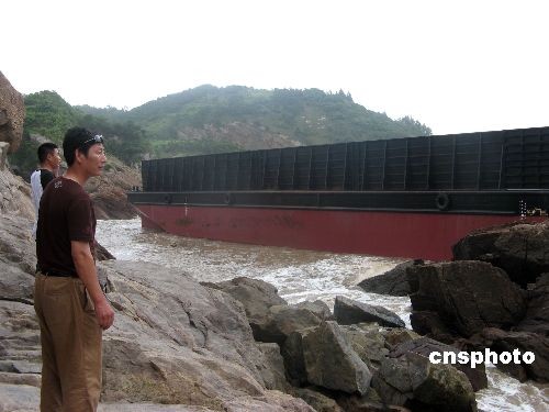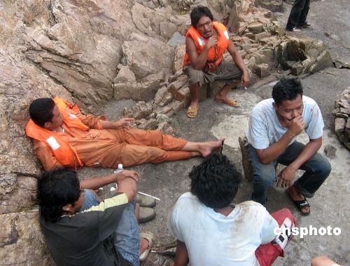 6月22日,受今年第3號熱帶風(fēng)暴“蓮花”外圍影響,印度尼西亞籍貨輪“永昌11號”在浙江洞頭海域避風(fēng)時遇險,后漂流到洞頭鹿西島,5名船員被當(dāng)?shù)剡叿烂窬⒋迕駹I救上岸。這艘遇險的外輪為駁船,船號為“永昌11號”,噸位為1000噸,其拖船為“LINTAS SAMUDERAXVI”,其駁船和拖船上共有10名船員,均為印度尼西亞籍船員。中新社發(fā) 蔡寬元 攝