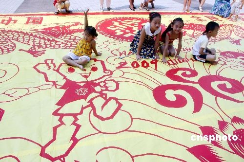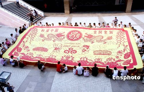 2009年7月5日,濟南剪紙藝術院的工作人員和市民在濟南市泉城廣場展示巨幅剪紙作品。當天是第十一屆全運會倒計時100天,濟南剪紙藝術院的120多名藝人耗時6個月,共同創作完成巨幅剪紙作品。據了解,該作品總面積61.6平方米,長11米(寓意第十一屆全運會),寬5.6米(寓意56個民族),主題為和諧中國、全民全運。作品中的圖案包含十一全運會標志、吉祥物泰山童子、荷花(濟南市花)、泉水等。中新社發 龔輝 攝