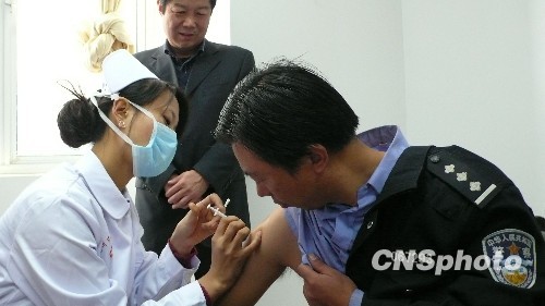 2009年11月5日,安徽省亳州市一線公安干警正在接種甲型流感疫苗。當日,在安徽省亳州市第一批52500劑甲型流感疫苗開始接種,據市衛生部門負責人介紹,因為疫苗的數量有限,按照省里計劃,這批疫苗的接種重點人群是,中小學教師和學生、公安干警、交通運輸部門工作人員、殯葬工作人員,還有醫療衛生部門的臨床一線和公共衛生人員等。對于這批甲型流感疫苗,亳州市衛生部門還確定了專門人員,確保對重點人群進行接種。中新社發 劉勤利 攝