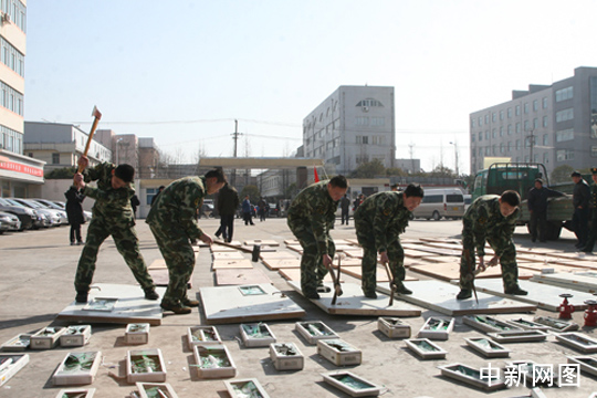 中新網連云港3月10日電 (蘇欣 吳茂新 朱曉穎)10日上午,在連云港市消防支隊營區院內,由消防部門聯合工商、質監共同查獲的不合格滅火器、消火栓、消防應急照明燈等520余件消防假冒偽劣產品被集中銷毀。