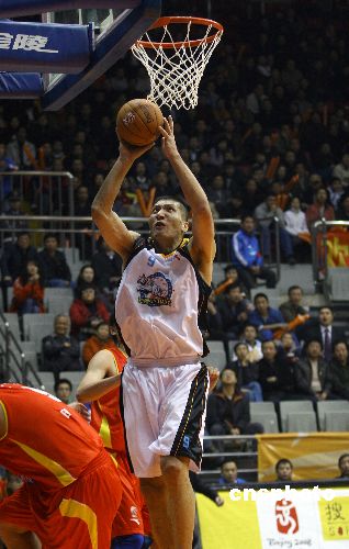 十月二十八日,新疆廣匯隊在烏魯木齊紅山體育館,主場迎戰陜西東盛隊,最終以一百一十五比一百零一戰勝對手,取得新賽季的開門紅。圖為,剛剛加盟新疆廣匯隊不久的中鋒巴特爾,在比賽中突破對方防線上籃。中新社發 劉新 攝
