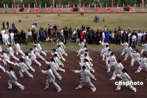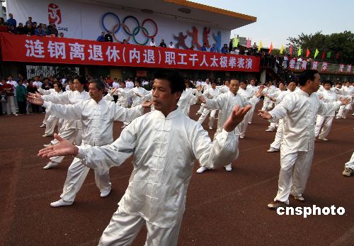 11月2日,湖南漣鋼離退休老職工參加千人太極拳表演。據悉,該集團為宣傳奧運會精神,開展“與奧運同行,與健康同行”千人太極拳表演活動。中新社發 郭國權 攝