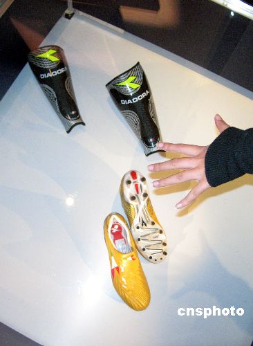 十一月十日,“2007米蘭設計制造展”在上海開幕,為意大利贏取2015年世博會主辦權造勢。意大利球星托蒂的“世界杯紀念球鞋”及蘊涵高科技的球員“護脛”隨這一展覽首次亮相上海。據介紹,這雙金色的足球鞋,是典型的米蘭設計風格,使用金色袋鼠皮配合意大利國旗的三色標志,鞋跟部的四顆星,象征意大利國家隊四度贏得問鼎世界杯。中新社發 許曉青 攝