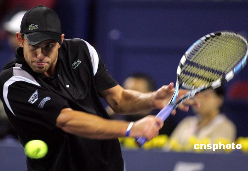 11月12日,在2007上海網球大師杯賽紅組首場單打比賽中,美國“火箭小子”羅迪克戰勝世界排名第4的俄羅斯選手達維登科,迎來本屆大師杯開門紅。中新社發 湯彥俊 攝