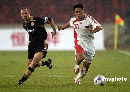 2007年12月18日晚,中國(guó)國(guó)奧隊(duì)與德甲科特布斯隊(duì)在佛山世紀(jì)蓮體育場(chǎng)交戰(zhàn),終場(chǎng)雙方1比1戰(zhàn)平。中新社發(fā) 吳峻 攝