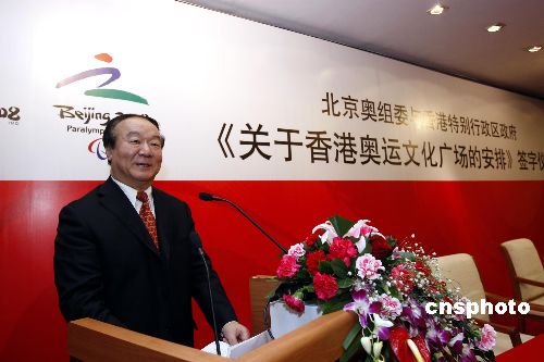 12月22日,北京奧組委與香港特別行政區政府就《關于香港奧運文化廣場的安排》在北京簽署協議。北京奧組委執行副主席蔣效愚與香港特區政府康樂及文化事務署署長周達明代表雙方簽字。香港奧運文化廣場將選擇交通便利的露天場所、休閑開闊地或公園內開展活動,設立電視大屏幕觀看奧運會比賽,舉辦文藝演出、主題展覽等,并對公眾免費開放。這項活動預計將從北京奧運會開幕時啟動,至殘奧會閉幕時結束。圖為北京奧組委執行副主席蔣效愚致辭。中新社發 杜洋 攝