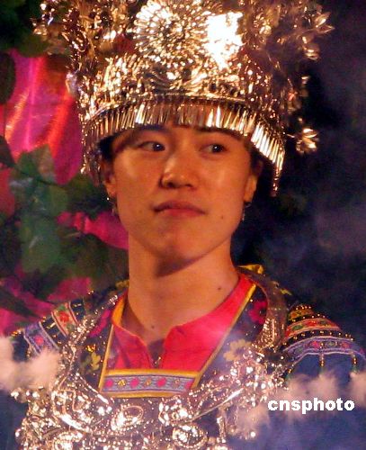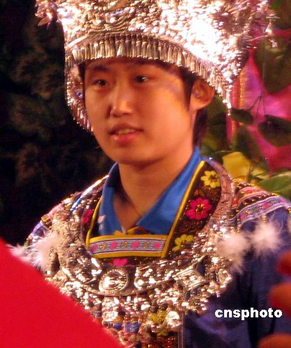 12月24日晚,2007年國際女子乒乓球?qū)官愒趶V西柳州拉開帷幕。賽前所有運動員都身穿當?shù)氐拿褡宸b亮相。中新社發(fā) 周瀟男 攝