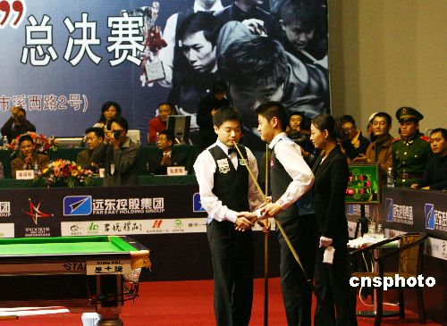 12月30日,2007年中國職業斯諾克巡回賽總決賽進入第5天,在宜興市體育中心舉行決賽,丁俊暉與一路過關斬將獲勝的梁文博同臺競技,以6比0輕松戰勝對手,再次奪冠 。中新社發 丁煥新 攝