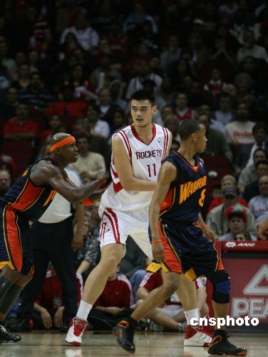 休斯頓火箭隊(duì)三十一日晚在主場豐田體育中心以九十五比一百一十二負(fù)于來訪的金州勇士隊(duì)。姚明在比賽中僅有八次出手,得到了十六分。阿爾斯通拿下火箭隊(duì)當(dāng)晚最高的二十二分。圖為當(dāng)日的比賽。中新社發(fā) 楊晉生 攝