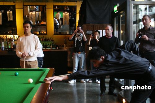 當地時間一月九日下午,中國“臺球神童”丁俊暉(擊球者)和香港名將傅家俊(穿白衣者)在倫敦唐人街的一間酒吧“過招”,推廣將在本月十三日開始的溫布利大師賽。中新社發(fā) 李鵬 攝