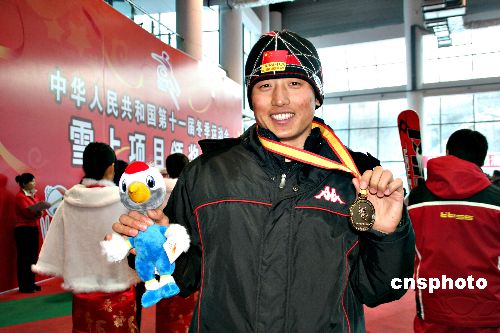 2008年1月21日下午3時30分,在哈爾濱亞布力雪具庫大廳,高山滑雪男子大回轉在此頒獎。哈爾濱代表隊李光旭摘得冠軍。據悉此項女子賽事明天將繼續進行。中新社發 姚庭山 攝