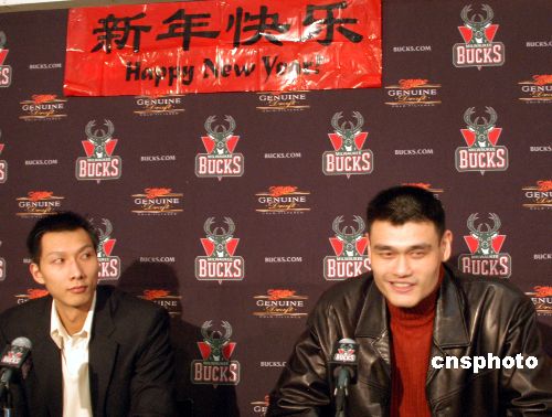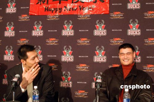 當(dāng)?shù)貢r間二月二日,姚明率領(lǐng)休斯敦火箭隊作客密爾沃基布拉德利球館,最終火箭隊以九十一比八十三險勝另一名中國球員易建聯(lián)所在的雄鹿隊,獲得三連勝。賽后兩位“中國德比大戰(zhàn)”的主角在雄鹿隊特地安排的聯(lián)合記者會上談笑風(fēng)生,一同向中國球迷致以新春祝福。中新社發(fā) 李靜 攝