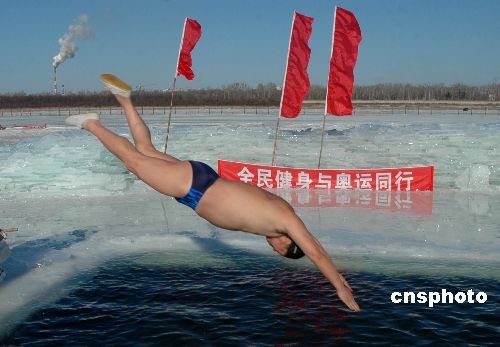 2月7日,黑龍江黑河市冬泳俱樂部與俄羅斯布拉戈維申斯克市冬泳俱樂部的30多名隊員,在黑河市中俄界江冒著零下30度的嚴(yán)寒,以冬泳方式歡度新春佳節(jié)。中新社發(fā) 邱齊龍 攝