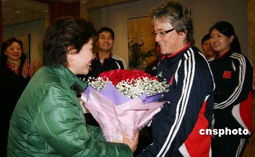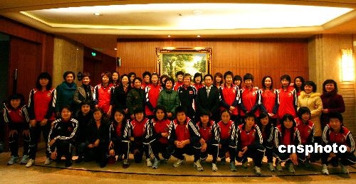 2月20日晚,重慶市婦聯主席蘭運華一行代表全市1500萬婦女和球迷看望慰問中國女足的全體隊員和教練員,希望她們再創佳績。同時向姑娘們贈送了鮮花、“鏗鏘玫瑰”書法、重慶特色的三峽碟畫等。中新社發 陳仕川 攝