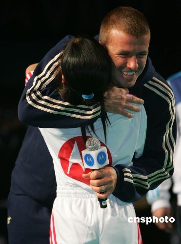 圖:貝克漢姆在上海與女球童熱情擁抱