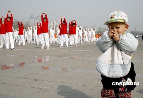 2008年3月10日,北京市海淀區委、區體委與甘家口街道辦事處聯合組織的“萬人健身迎奧運”活動在中央電視塔下舉行。中新社發 黃小兵 攝